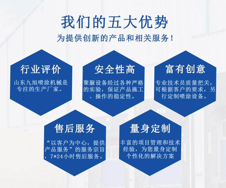 山東九旭機械科技有限公司歷經(jīng)十幾年的發(fā)展,已成長為液壓聚脲設備行業(yè)頗具實力的設備制造業(yè)之一。主要產(chǎn)品:聚氨酯高壓噴涂機、聚氨酯高壓發(fā)泡機、液壓聚脲噴涂設備及設備配件(聚氨酯高壓噴槍、槍嘴、加熱管道、料塊、摩擦副、增壓泵、混合式、提料泵等)也是堅持最好的質量服務用戶,
